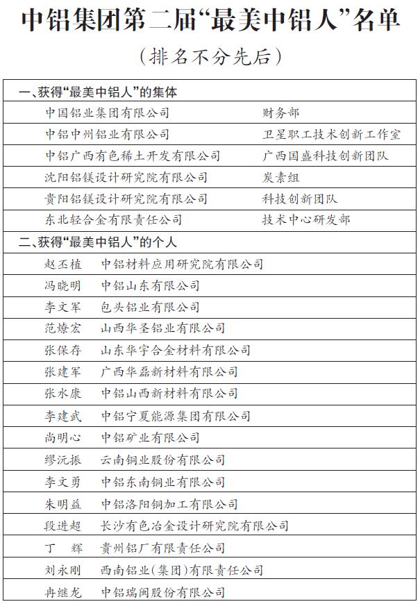 经过企业(部门)推选、投票海选、评审优选和综合审议,中铝集团授予中铝集团财务部、中铝中州铝业有限公司“卫星职工技术创新工作室”、中铝广西有色稀土开发有限公司“广西国盛科技创新团队”等6个集体和中铝材料应用研究院有限公司赵丕植、中铝山东有限公司冯晓明、包头铝业有限公司李文军等16位员工第二届“最美中铝人”荣誉称号。